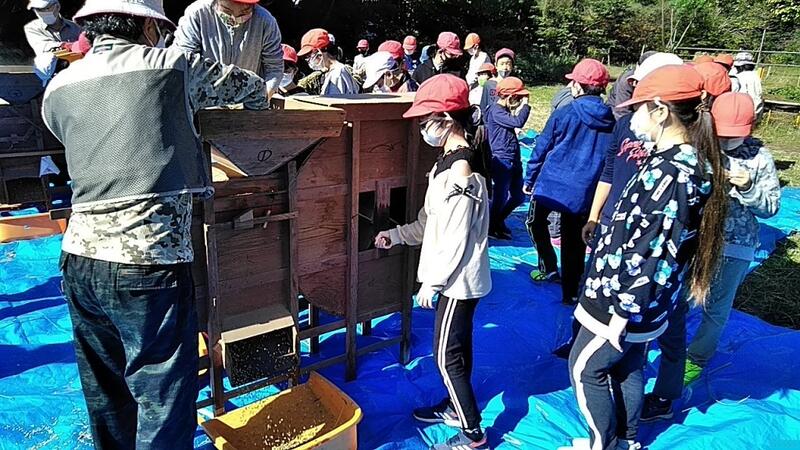 10月13日に稲刈りが終わり約2週間後の本日、下田の杜を守る会の皆さんの指導で、脱穀を行いました。昔ながらの足踏み脱穀機、とおみを使いました。みんなで協力し、約20キロの収穫がありました。またこれから精米の作業と続きます。