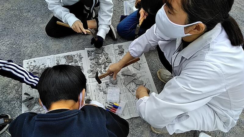 理科支援員の鈴木先生の指導で、約30万年前の地層から「化石」を発見するという体験を6年生が行いました。層になった固まりを金づちでたたきながら慎重に作業を進めました。その結果………