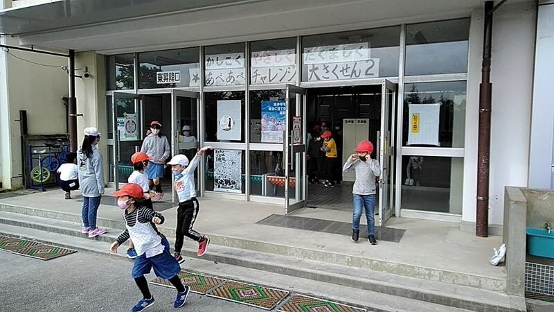 ↑昇降口から外に出る子どもたち ↑ゴリラグループ