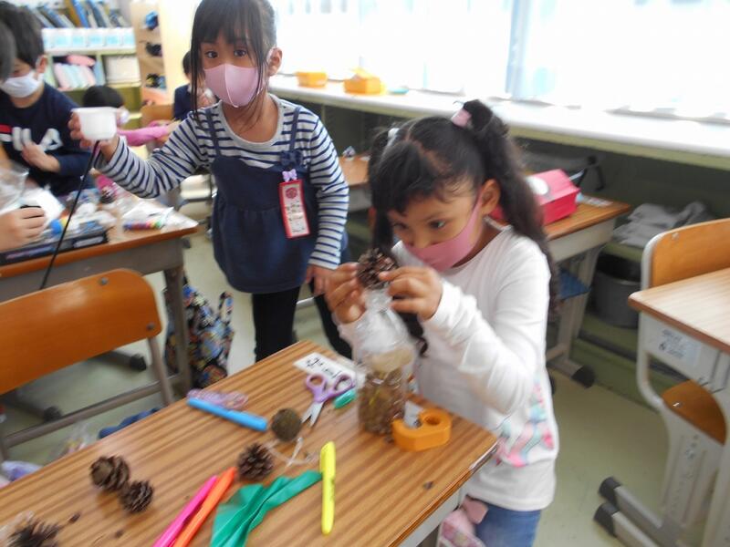 ↑生活科で(左…松ぼっくりかざり作り・右…オナモミで的当て大会)