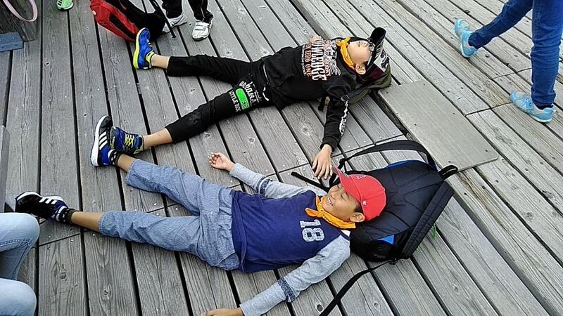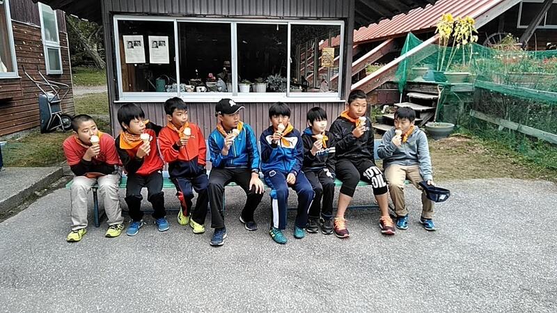 ↑「大の字」になって空を見上げ「きもちいい」↑休憩では担任から「元気の出るあめ」配給