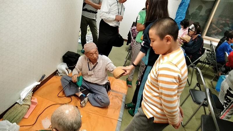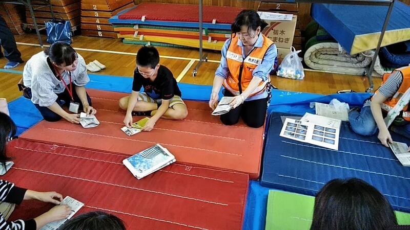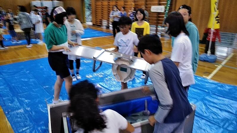 ↑6年生は「簡易トイレ」の作り方↑5年生は三角巾の使い方紙スリッパの作り方