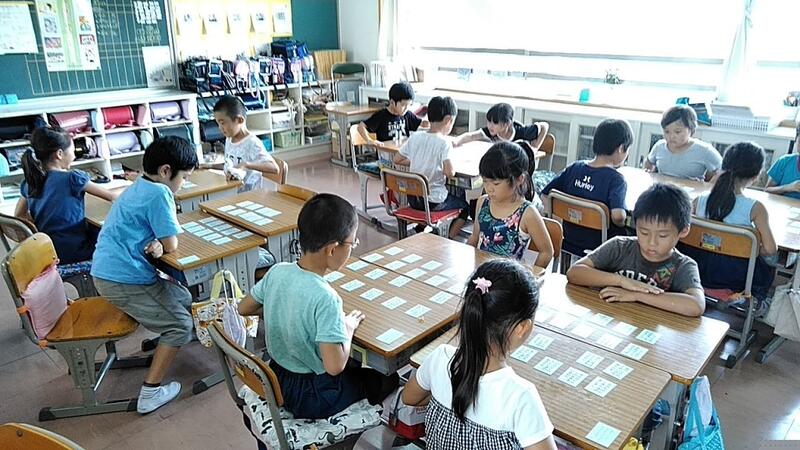 2年2組では、2学期が始まってから、そうじが終わって5時間目が始まるまでの5分間で「五色百人一首」をしています。皆さんご存知の「百人一首」は100枚の札の取り合いですが、これは100枚を5色(20枚)にわけて行うため、1回の試合時間が3分〜5分程度で終わり、手軽にできます。また、楽しく集中して行え、学級でのルールを守ることが学べ、さらに学級内で男女が仲良くなるなどいいことづくめです。