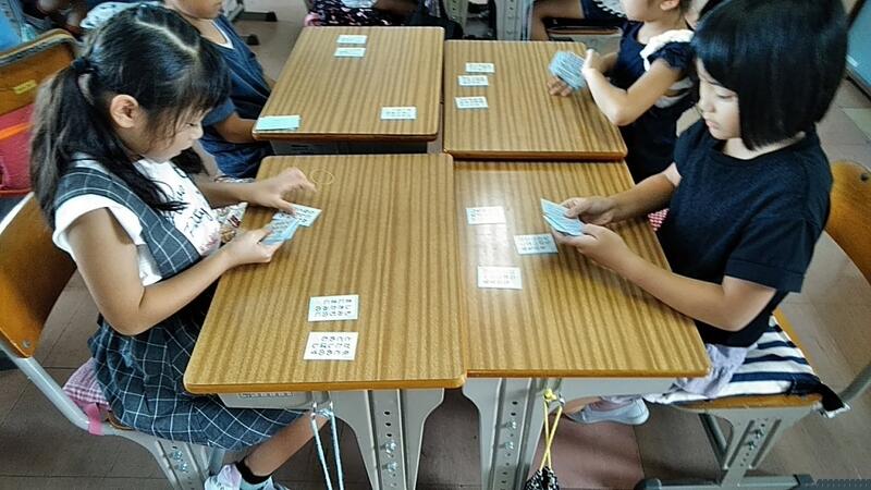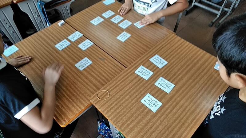 ①先生が札(青色20枚)を配ります ②向かい合わせで1人10枚ならべます