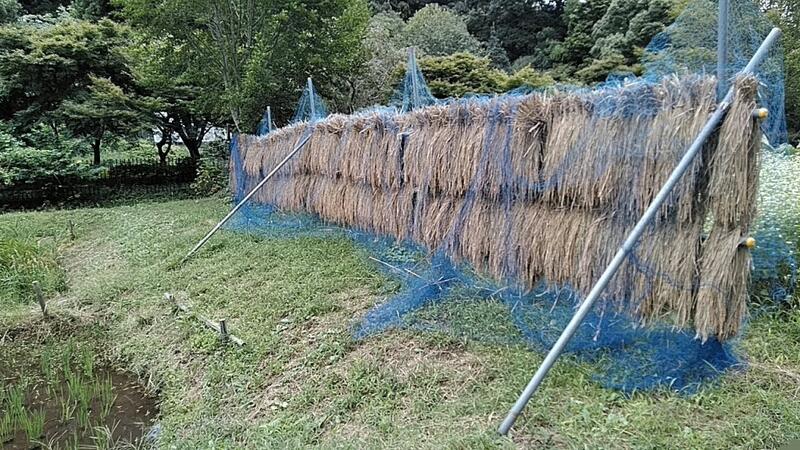 ↑「バッタを取ったぞ!」 ↑草むらの隣は先日刈った稲が干してありました