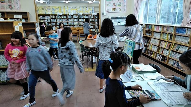 先週、今週と天気があまりよくないこともあって、なかよしタイムや昼休みの図書室には大勢の子どもたちがきています。今年度から1回に3冊借りられることになり、貸出数も約1.5倍(昨年比)に増えています。図書室には、図書館指導員の大石先生が常駐し、貸し出しの他、調べ学習でのアドバススなど本に関する相談もしてくれています。