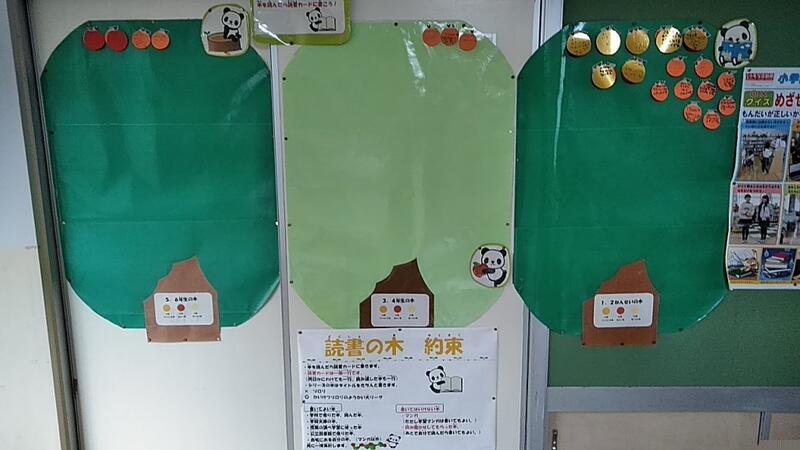 ↑休み時間の図書室 ↑読書の木(高学年50中学年80低100冊読むと名前がはられます)