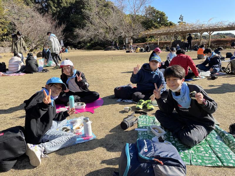 たくさん歩いた子どもたち。おにぎりを口いっぱいにほおばっていました。