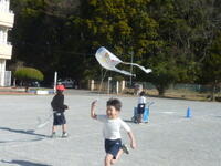 1年生が,昔あそびで学習した凧あげを行いました。凧に書かれた図柄は,自分たちで描いたものです。