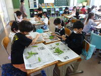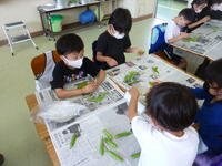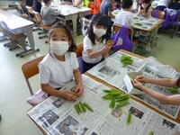 1年生と2年生で給食の食材「グリンピースのさやむき体験」を行いました。