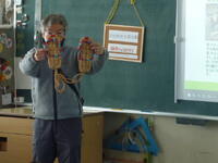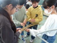 今日は下田の杜の皆さんが,酒西小に来ていただき,「脱穀」の後に残った「稲わら」を用いた「リース作り」を行いました。まずは,「なわない」という作業。いくつかの稲わらを束ね,みんなで協力して縄のように編む作業です。