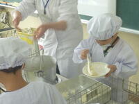 配膳台や,食缶の出し方,配膳の仕方を,担任の先生や栄養士の先生に教わりながら行いました。