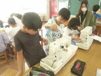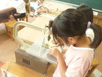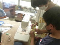 ミシンを使って縫っていきます。ミシンも手慣れたものです。紐を通す穴もしっかりと縫うことができ,