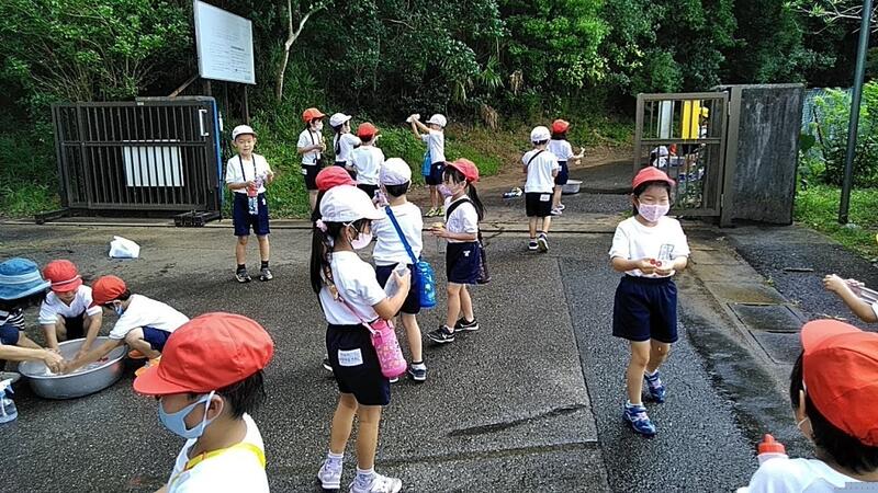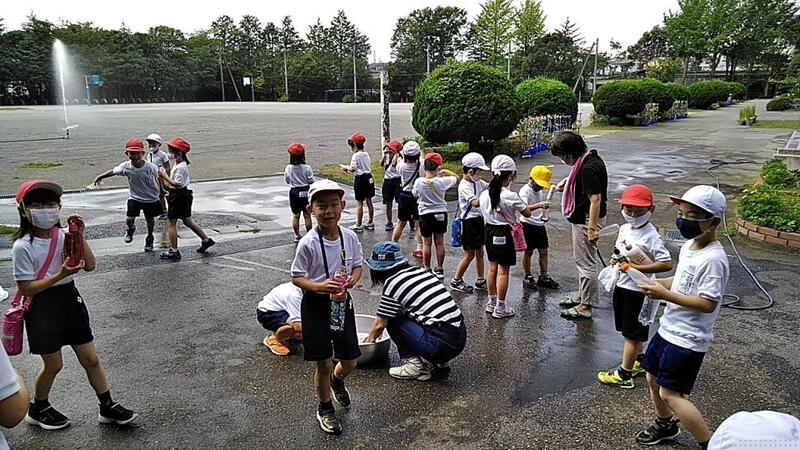 1年生が、空いた容器に水を入れて飛ばしあう遊びをするというので、準備を手伝い、HPに載せようと思い、写真を撮り始めたのですが、何人かが私に向かって水を飛ばしにきて、結局びしょびしょになってしまいました。(笑)何人も同じようになったようですが、みんなとても楽しそうでした。