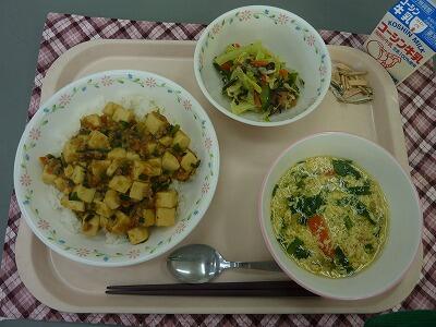 牛乳 マーボー豆腐丼 チョレギサラダ にら卵スープ アーモンド小魚