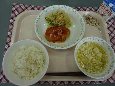 牛乳 ごはん ヤンニョムチキン 春雨サラダ 卵と白菜のスープ 大豆小魚