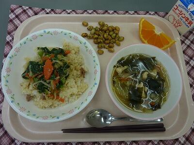 牛乳 ビビンバ丼 春雨スープ デコポン 大豆スナック