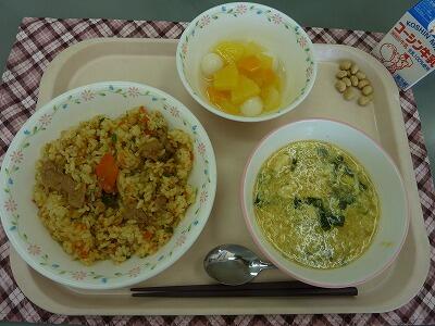 牛乳 プルコギチャーハン 中華たまごコーンスープ フルーツ白玉 いり大豆
