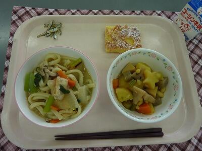 牛乳 味噌煮込みうどん 炒りどり 手作り米粉のりんごケーキ 小魚