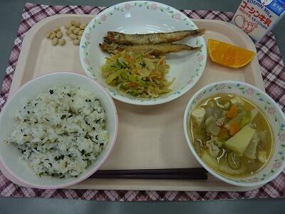 牛乳 わめごはん ししゃもの唐揚げ ごま和え 豚汁 デコポン いり大豆