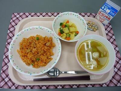 牛乳 チキンピラフ マセドアンサラダ マカロニスープ 大豆小魚
