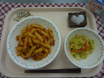 牛乳 ペンネアラビアータ バジルドレッシングサラダ 手作りチョコレートブラウニー 小魚