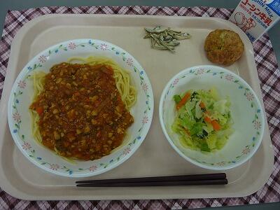 牛乳 スパゲティーミートソース キャベツのさっぱりサラダ 手作りアールグレイスコーン 小魚