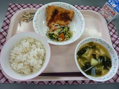 牛乳 ごはん チキンカツ 和風サラダ じゃが芋のみそ汁 アーモンド小魚