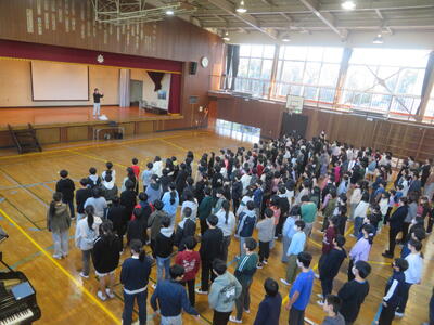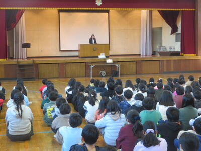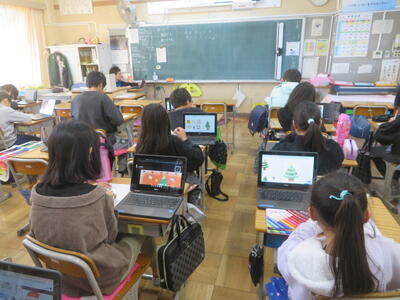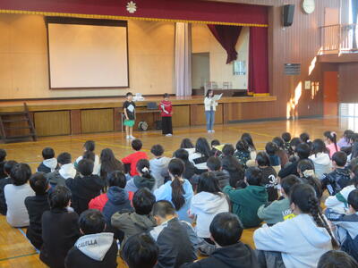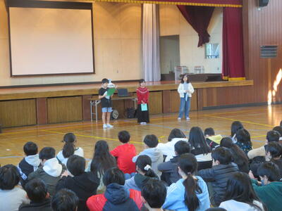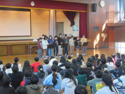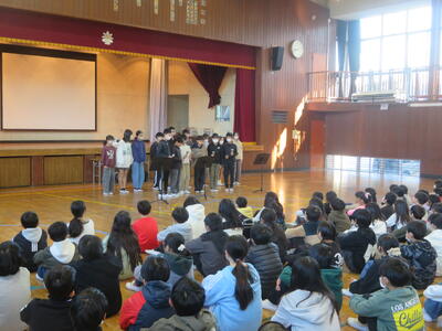 23日(火)は2学期の終業式でした。校長先生からは2学期も行事や勉強など頑張りましたとあり、冬休みにおうちの手伝いをしてくださいねとの話がありました。そして、6年生からハンドベルによる演奏のプレゼントもありました。2学期を振り返ってでは、音楽発表会で頑張ったこと、中学年遠足に行ったこと、マラソン大会で頑張ったことなどを発表してくれました。最後は「ジングルベル」を全校で歌いました。