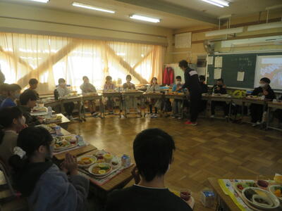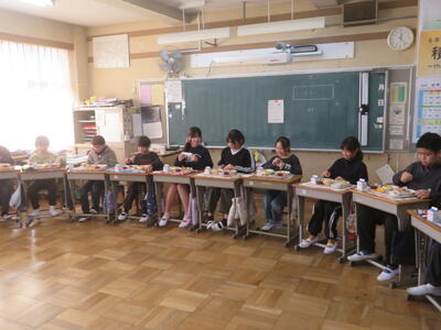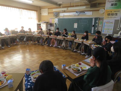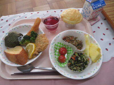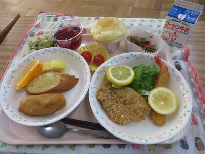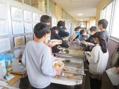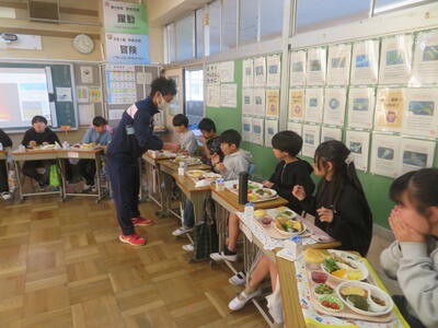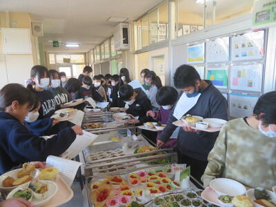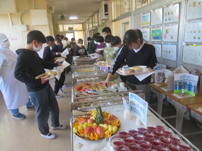 19日(金)は、6年生だけの特別バイキング給食でした。事前に、エビフライかタンドリーチキンなど、いくつかの献立を選択し、選んだメニューを自分でとって盛り付けます。調理員さんたちは6年生のために、朝早くから準備してくださいました。「いただきます」と笑顔で子どもたちは食べ始めました。