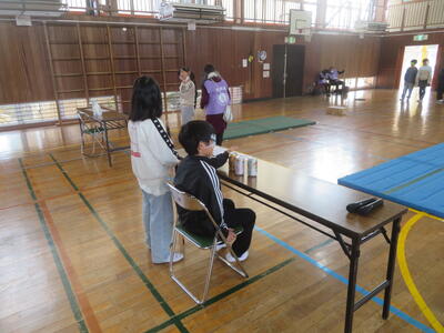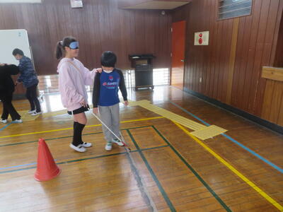 28日(水)に4年生が社会福祉協議会の方のお力をお借りして、福祉教育を行いました。まずは、体育館で白杖体験をしました。一人がアイマスクをして白杖を持ち、もう一人がガイド役となり、一緒に歩きます。点字ブロックの上を歩いたり、椅子に座らせたり、シャンプーとリンスの区別をさせたりしました。1回行った後に交替し、どちらの立場も体験しました。その後は、教室で白杖を使っている方の話を聞いたり、白杖を使っている人と一緒に遊ぶにはどのようなルールを作ったらよいかを話し合ったりと、2時間目から4時間目まで、相手の立場を考える学習に取り組みました。