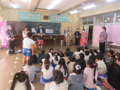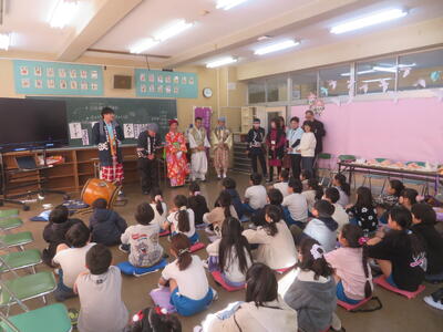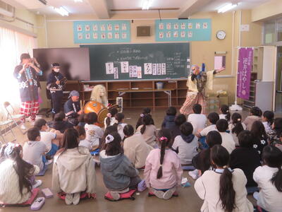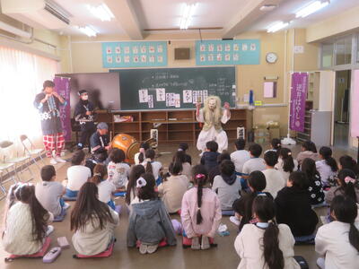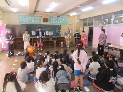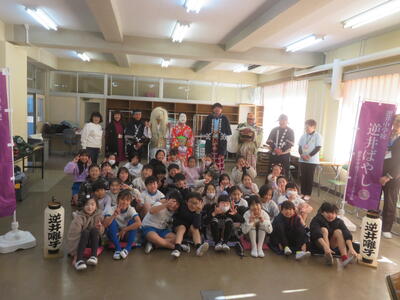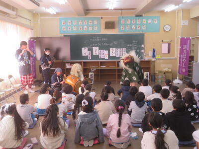 逆井囃子を知っていますか。逆井囃子は逆井冨士浅間神社で約200年前から続くもので無病息災、五穀豊穣、家内安全を願った奉納されたお囃子です。今日は、3年生が音楽科の学習で、逆井囃子保存会の方をお招きして、実際の逆井囃子を鑑賞しました。感想を聞かれると「迫力のある演奏だった」「名前と動きが一緒ですごかった」と子どもたちが発表しました。