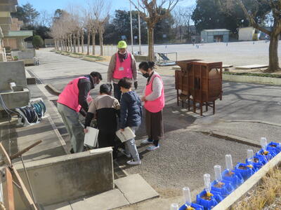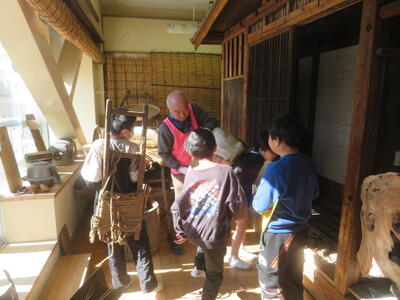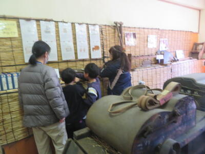 逆井小学校には、ふるさと資料室といって昔の家、道具が展示されている教室があります。これは、どの学校にでもあるものではなく逆井小学校ならではの教室です。逆小スマイルの皆さんが数年がかりで整備してくださったおかげで、毎年、3年生が社会科の学習で見学しています。3日に、1組、2組がそれぞれ見学しに来ました。逆小スマイルの皆さんも手伝いに来てくださり、子どもたちは昔の家のたたみに座って「昔」を感じていました。