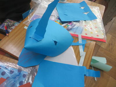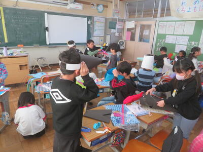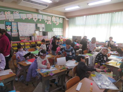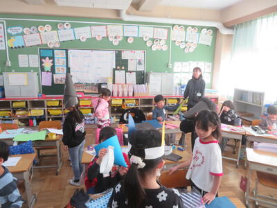 4日(水)に1年生が図画工作科の学習を行いました。「つくってへんしん」といって、思い思いの道具を作って自分を変身させます。魔女に変身するための道具を一生懸命作っていました。