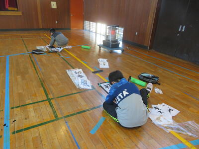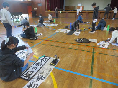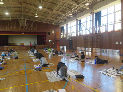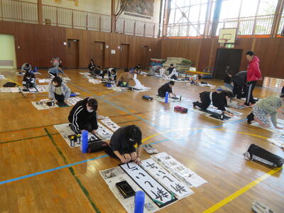 27日(水)に体育館で書き初め練習会を行いました。講師の先生をお招きし、書くときのポイントを教わり、書き始めました。3年生は大きな筆で書くのは初めての人がほとんどでしたが、一生懸命書いていました。書いた作品を講師の先生に持って行き、ポイントをさらに教えてもらいます。講師の先生が「朱」で書き足してくださった作品は、新しい手本となりますね。
