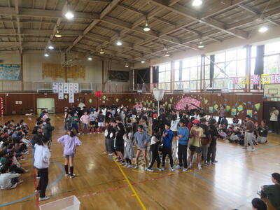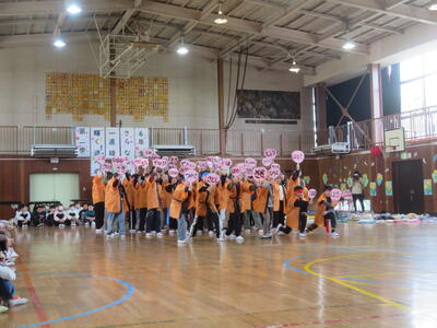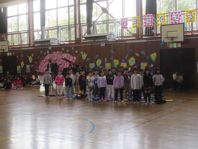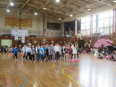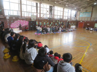 2年生は、6年生にアンケートをし、それを基にしたクイズと歌の発表でした↓