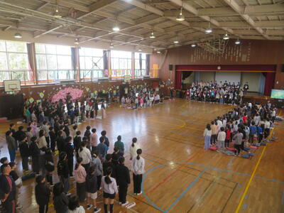児童会の引継ぎです。思いやり、積極性、責任感、礼儀の鍵を引き継ぎました↓