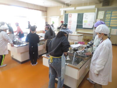 19日(金)は、6年生だけの特別バイキング給食でした。事前に、エビフライかタンドリーチキンなど、いくつかの献立を選択し、選んだメニューを自分でとって盛り付けます。調理員さんたちは6年生のために、朝早くから準備してくださいました。「いただきます」と笑顔で子どもたちは食べ始めました。