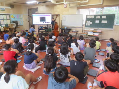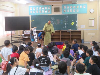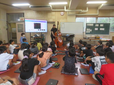 10日(木)の1時間目に4年生が国語科で学習した「落語」を聞きました。落語を演じているのは逆井小学校の職員です。また、先日は音楽科の授業でコントラバスの演奏を聞いたのですが、演奏者は逆井小学校の職員です。いつもとは違う姿に子どもたちもびっくりしていました。