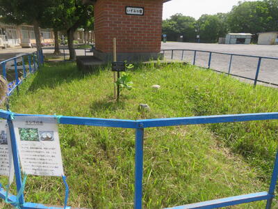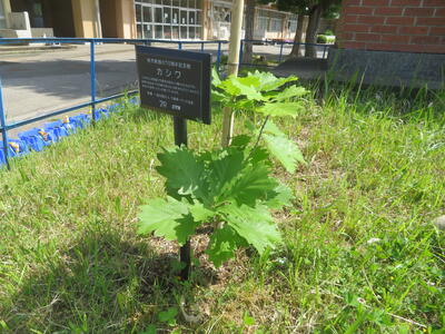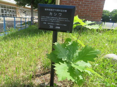 昨年度市制70周年の記念に植樹したかしわの木が育っています。細い枝に、大きな葉を茂らせて大きくなろうとしています。元気に育ってほしいところです。