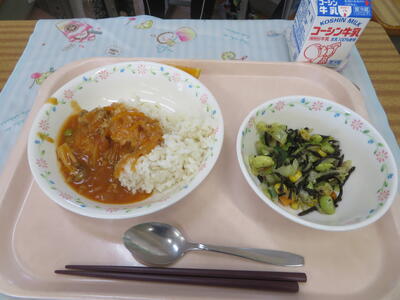 9日(水)は、今年度最初の給食でした。今日の献立は、ハヤシライス、ひじきのカラフルサラダ、清見オレンジ、アーモンド小魚でした。新しいクラスで、今までのルールとは少し違うところもあったでしょうが、新たなクラスで新しいルールで楽しく、おいしい給食を食べていきましょう!