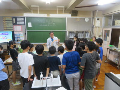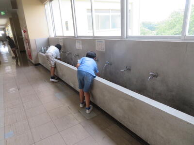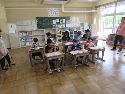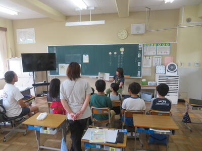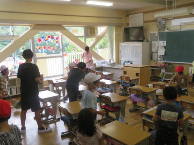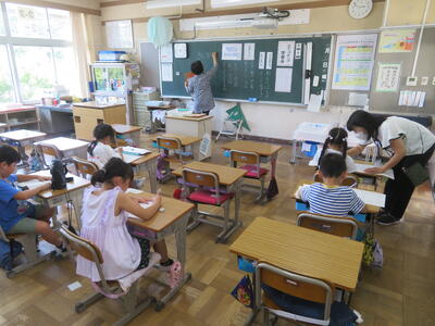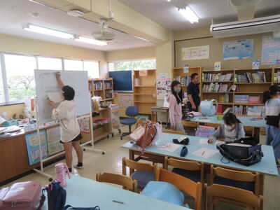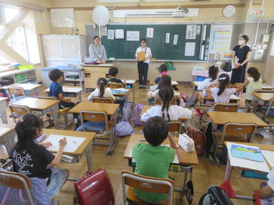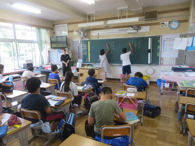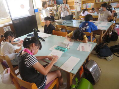 7月20日(土)から長い夏休みが始まりました。毎日、暑い日が続いていますが、23日(火)から25日(木)までの3日間は、夏季学習会が行われています。3~6年生が対象で、午前中に、プリントや夏休みの課題に取り組みます。隣の柏陵高等学校の生徒がボランティアとして、先生役を担ってくれています。
