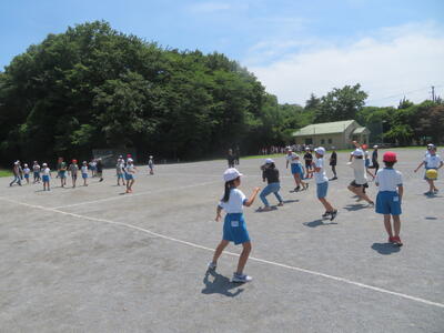 1,6年はどろけいです。6年生はスキップで逃げ回ります↓
