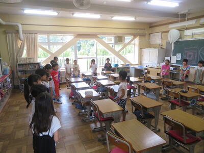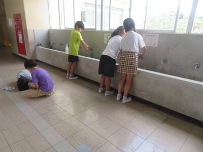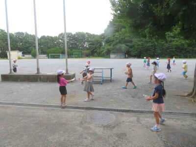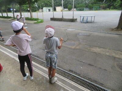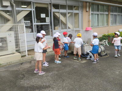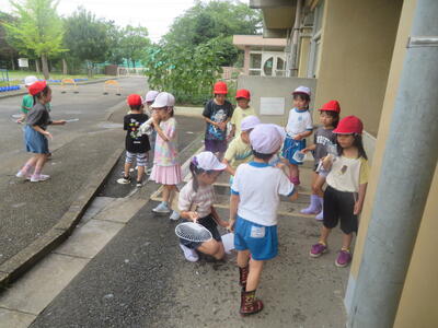 11日(木)に、1年生がシャボン玉遊びを行いました。うちわやストローなど持ってきたものを使ってシャボン玉づくりに挑戦しました。その後は、水遊び。外で楽しく活動しました。