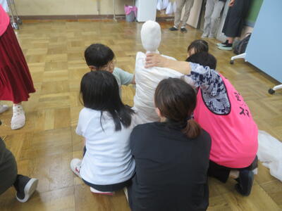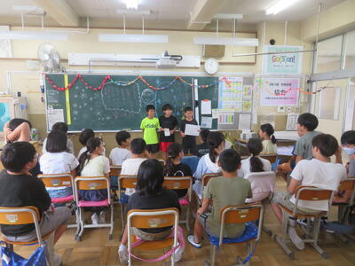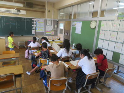 4年生の算数科では、そろばんの学習があります。いろいろな大きさの数をそろばんに入れてみたり、簡単な計算をしてみたりしました。3年生でも学習しているとはいえ、ほとんどの子どもたちにとってあまりなじみのない道具かもしれません。逆小スマイルの方たちが学習のサポートに来てくださいました。子どもたちは、自分でそろばんを動かした結果ががあっているかどうかを確認してもらっていました。