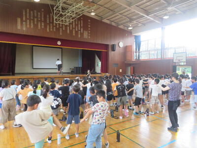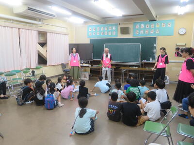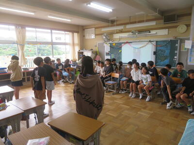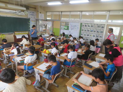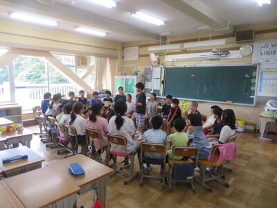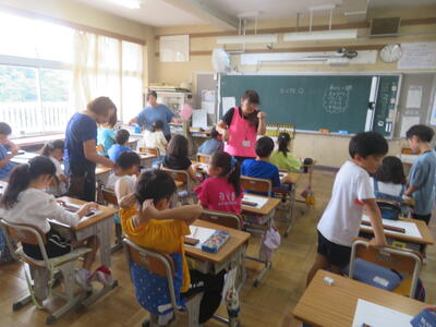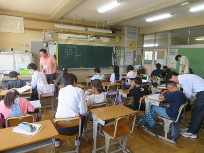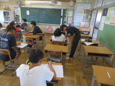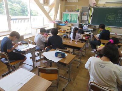 7月20日(土)から長い夏休みが始まりました。毎日、暑い日が続いていますが、23日(火)から25日(木)までの3日間は、夏季学習会が行われています。3~6年生が対象で、午前中に、プリントや夏休みの課題に取り組みます。隣の柏陵高等学校の生徒がボランティアとして、先生役を担ってくれています。