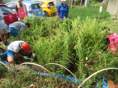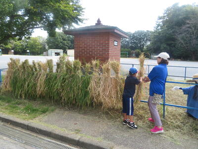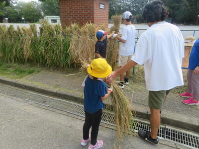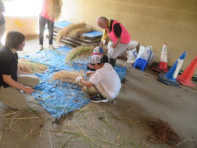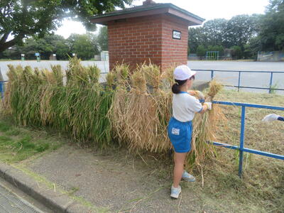 18日(水)になのはな学級の皆が、逆小スマイルの方の力を借りて、稲かりを行いました。5月にしろかき、田植えをし、水やりを行いながら、大切に育ててきた稲をいよいよ刈り取ります。刈り取った稲は束ねて干しておきます。このあと、昔の道具を使って脱穀などをしていきます。お米になるまでにはもう一手間、二手間かかりますね。