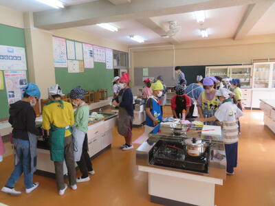 23,24日に、5年生は林間学校に行きます。そのために、実行委員やキャンプファイヤーの練習など様々な取組みをしてきました。22日は、家庭科室でカレー作りの練習をしていました。当日は、まきに火をつけて作りますが、今日はガスコンロで行いました。この経験を実際の林間学校生かしてほしいと思います。