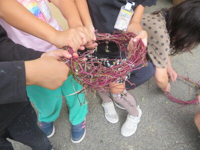 24日(木)の1時間目に1年生が校庭で1学期から育てていた朝顔の鉢の土を片付けていました。何をしているのかなと見ていると、枯れた朝顔のツルを使ってリースづくりを始めました。ツルを束ねて友だちと協力してと、「芽が出た」