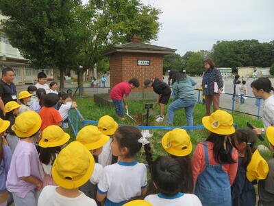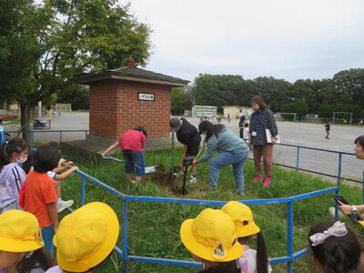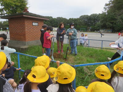 柏市は今年市制70周年を迎えます。それを記念して、小学校に「かしわの木」を植えることになりました。逆井小学校では、栽培委員会が中心となって市制70周年について、かしわの木について調べたことを発表し、いずみの家の近くに植樹しました。大きくなるのが楽しみです。